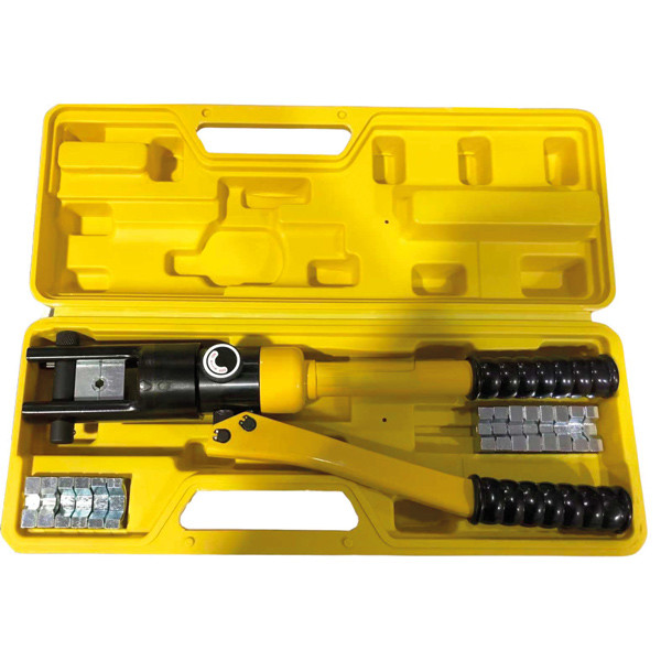 Hydraulpress för kabelskor och hylsor. Pressen gör det enkelt att pressa även de största kabelskorna och hylsorna. Den levereras i en väska och har verktyg för 10-120 mm².