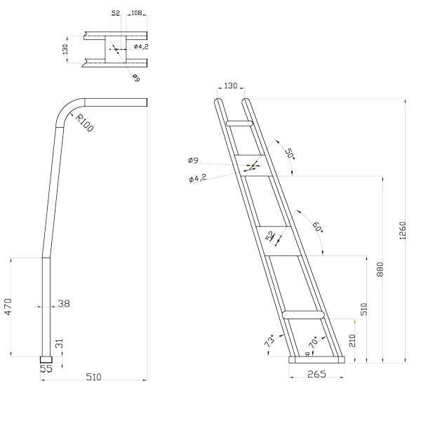 Svart electro coated rostfritt stål AISI 316 och justerbar höjd. Monteras med vippbeslag så att targabågen kan fällas ner för att ev. köras under en bro.7 monteringsplattor och 4 Ø25 mm rör för ev. montering av antenner och lanternor.