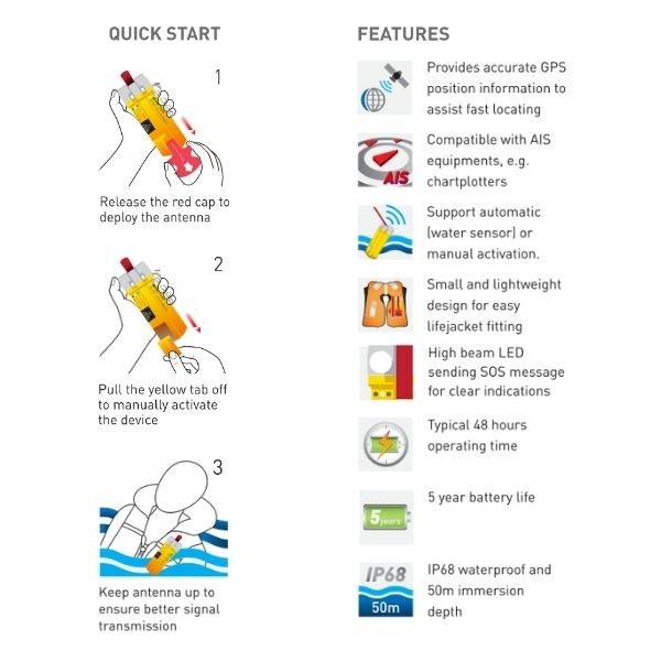 Via din egen AIS-utrustning skickas din plats till närliggande fartyg som är utrustade med AIS-utrustning. TB-520 är liten, lätt och enkel att använda.I en nödsituation kan TB-520 aktiveras antingen automatiskt (via vattensensor) eller manuellt. När det är aktiverat skickas ett varningsmeddelande med GPS-position och ett unikt AIS MOB-nummer som är förprogrammerat i enheten. Enheten kan monteras på din flytväst med de medföljande clipsen.
