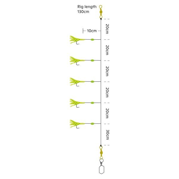 Torsk och sej är aldrig rädda för stora beten. Denna superkombination av stora #3/0-krokar och tobisimitationer kommer definitivt att fånga den stora fisken åt dig.