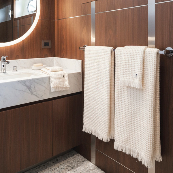 Detta set består av tre våffladebomullshanddukar i storlekarna 30×50, 50×100 och 70×140 cm. Handdukarna är lätta, absorberande och snabbtorkande – praktiska ombord, i sommarstugan eller på stranden.Vaffelstrukturen minskar volymen och gör handdukarna enkla att komprimera och förvara ombord, eftersom de tar mindre plats än traditionella frottéhanddukar. Materialet är mjukt mot huden.