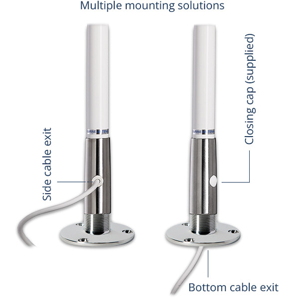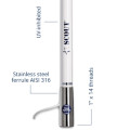 KS-41 är en kompakt VHF-antenn i TITAN-serien, designad för båtar där utrymmet är begränsat, men stabil mottagning och hög tillförlitlighet fortfarande krävs. Den korta konstruktionen på 1,2 m gör antennen enkel att placera på mindre styrhytter, konsoler eller relingen.Antennen är tillverkad av 2 mm glasfiber, vilket ger god styrka och motståndskraft mot väder och vibrationer. Basen är tillverkad av elektropolerat rostfritt stål AISI 316 med konisk design, vilket säkerställer en solid och korrosionsbeständig montering.