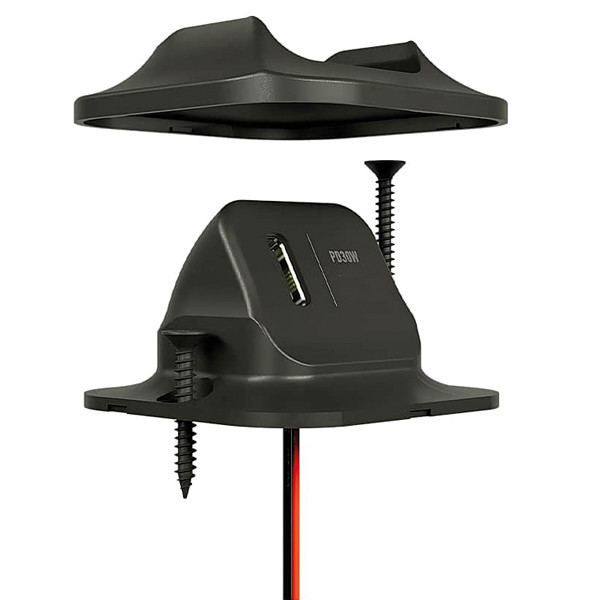 Kompakt USB-C snabbladdare för installation på öppna båtar där stabil och väderbeständig strömförsörjning krävs. En praktisk lösning för laddning av telefoner och utrustning i tuffa miljöer.Enheten levererar upp till 30 W via USB-C och är byggd för att fungera i både 12 V och 24 V system. Konstruktionen är vattentät och IP68-klassad, vilket garanterar fullständigt skydd mot vattenintrång. Den lutande konnstruktionen ger enkel åtkomst till kabeln.